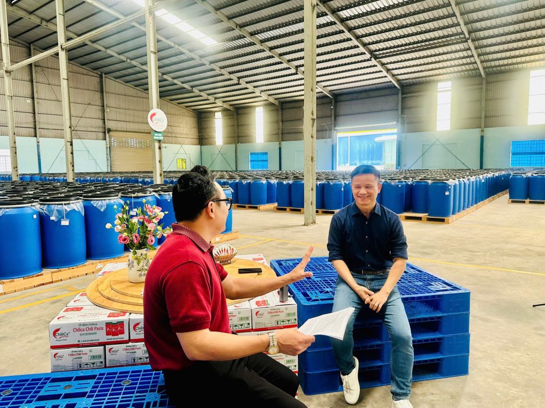 Sáng nay thực hiện talkshow tại nhà máy ChiliCa, MC Phương Hiếu nói chưa khi nào thấy bối cảnh quay độc lạ như vậy. Các bạn trong team ChiliCa đã setup bộ bàn ghế để talk cũng rất ư là hầm hố, đúng phong cách của nhà máy sản xuất tương ớt lên men!